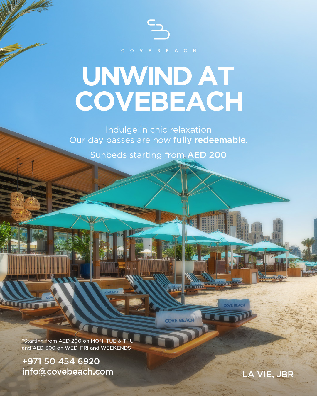 Welcome to COVEBEACH, the premiere luxury party beach club in the UAE that’s known for its chic yet modern decor and contemporary art. Nestled against the sun-kissed shores of the Arabian Sea, it has become a destination to escape from the city. Unwind on our private luxury cabanas and take a dip in our stunning pools, a perfect backdrop for relaxation. Enjoy the finest selections of wines and spirits in our Rosé Lounge, surrounded by the mesmerizing sunset overlooking Ain Dubai. Enjoy an unforgettable dining experience at Sierra by COVEBEACH, where every dish takes you on a culinary journey through the Mediterranean. Sip on our handcrafted cocktails on our beach deck, surrounded by the gentle sounds of the waves. Celebrate life and make memories at our iconic parties, where our resident DJs and performers take centre stage to create a vibrant energy like no other.