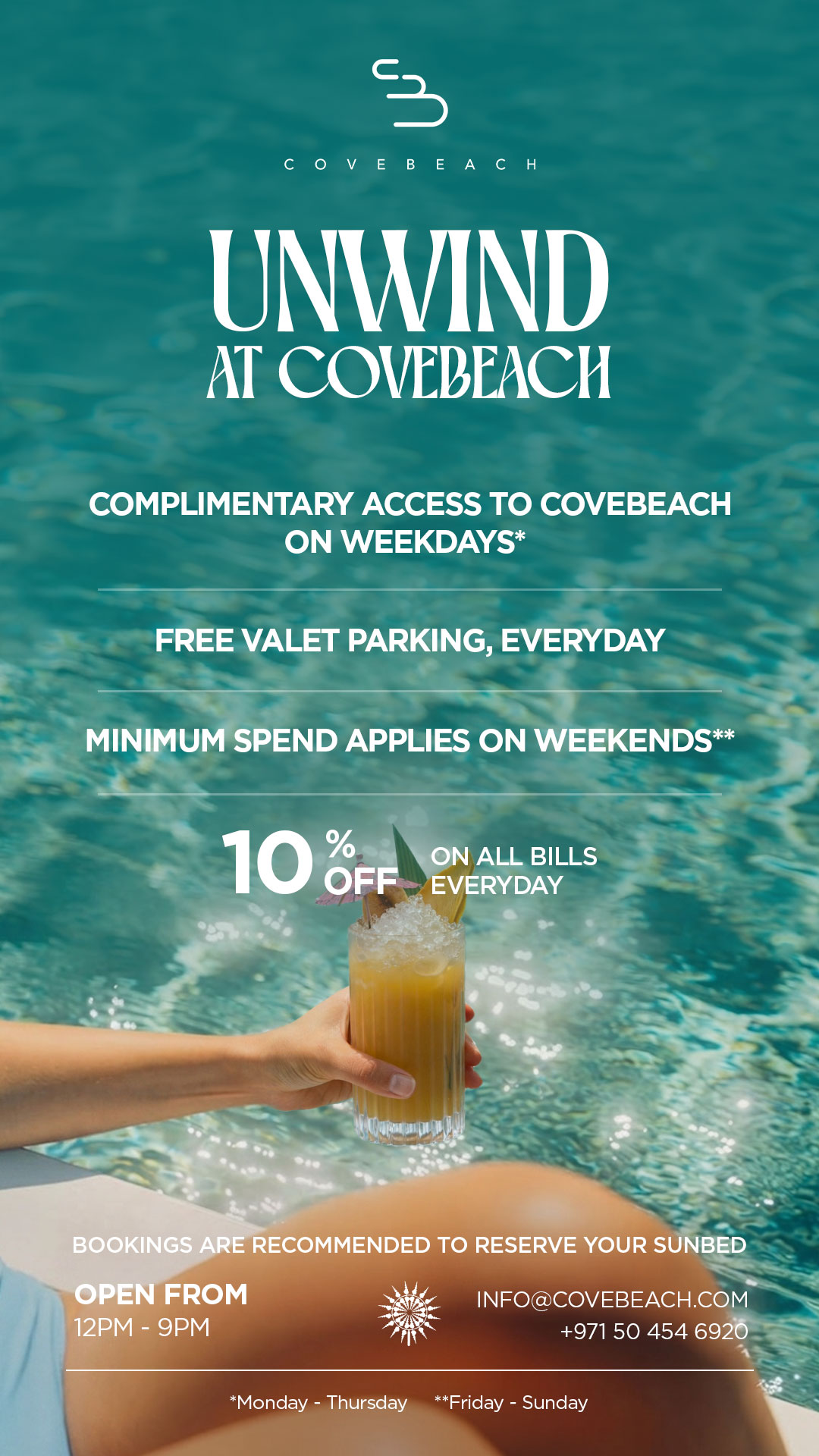 Welcome to COVEBEACH, the premiere luxury party beach club in the UAE that’s known for its chic yet modern decor and contemporary art. Nestled against the sun-kissed shores of the Arabian Sea, it has become a destination to escape from the city. Unwind on our private luxury cabanas and take a dip in our stunning pools, a perfect backdrop for relaxation. Enjoy the finest selections of wines and spirits in our Rosé Lounge, surrounded by the mesmerizing sunset overlooking Ain Dubai. Enjoy an unforgettable dining experience at Sierra by COVEBEACH, where every dish takes you on a culinary journey through the Mediterranean. Sip on our handcrafted cocktails on our beach deck, surrounded by the gentle sounds of the waves. Celebrate life and make memories at our iconic parties, where our resident DJs and performers take centre stage to create a vibrant energy like no other.