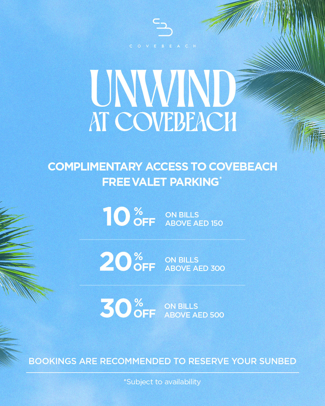 Welcome to COVEBEACH, the premiere luxury party beach club in the UAE that’s known for its chic yet modern decor and contemporary art. Nestled against the sun-kissed shores of the Arabian Sea, it has become a destination to escape from the city. Unwind on our private luxury cabanas and take a dip in our stunning pools, a perfect backdrop for relaxation. Enjoy the finest selections of wines and spirits in our Rosé Lounge, surrounded by the mesmerizing sunset overlooking Ain Dubai. Enjoy an unforgettable dining experience at Sierra by COVEBEACH, where every dish takes you on a culinary journey through the Mediterranean. Sip on our handcrafted cocktails on our beach deck, surrounded by the gentle sounds of the waves. Celebrate life and make memories at our iconic parties, where our resident DJs and performers take centre stage to create a vibrant energy like no other.